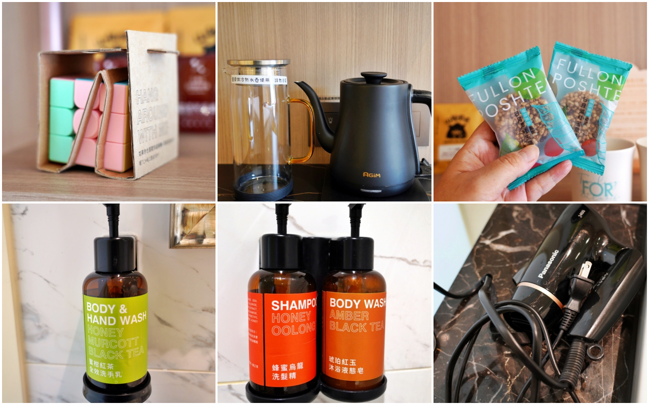 不過飯店還是有提供一些貼心的備品,比如設計感十足的電熱水器、吹風機、小玩具、以南投厲害的茶主題的洗髮精/沐浴乳/洗手乳。