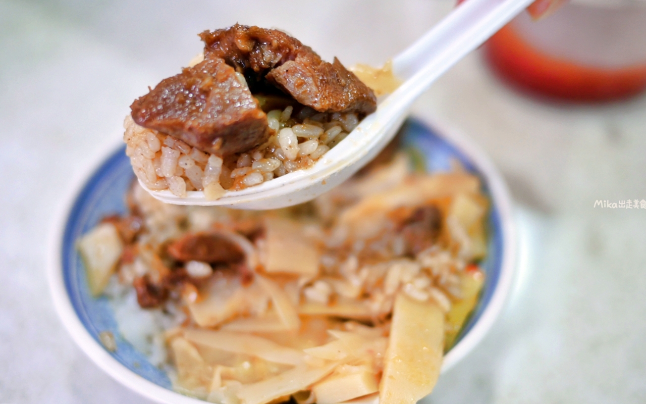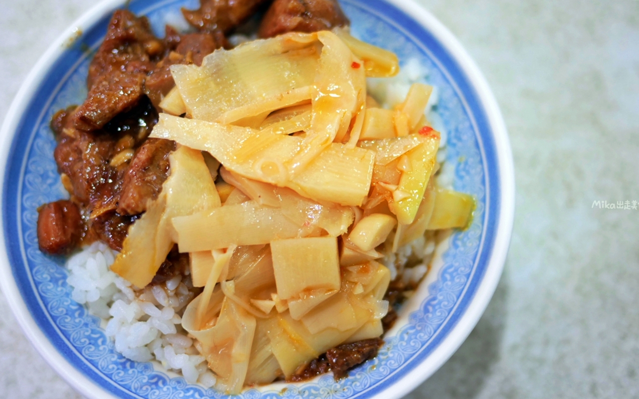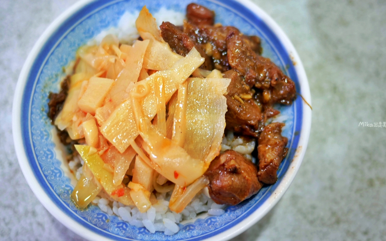 對的,廟東夜市裡,有名的炸菱角酥旁這家,陪豐原人長大的樸實料理小吃,獨特蒜肉飯名字很酷,但其實只是骰子豬、筍片與白飯的組合,沒有你以為的一堆蒜頭或是蒜蓉等…但淋在飯上的滷汁有淡淡的蒜香,鹹香夠味但少了點驚喜感,也許是我們期待太高。
