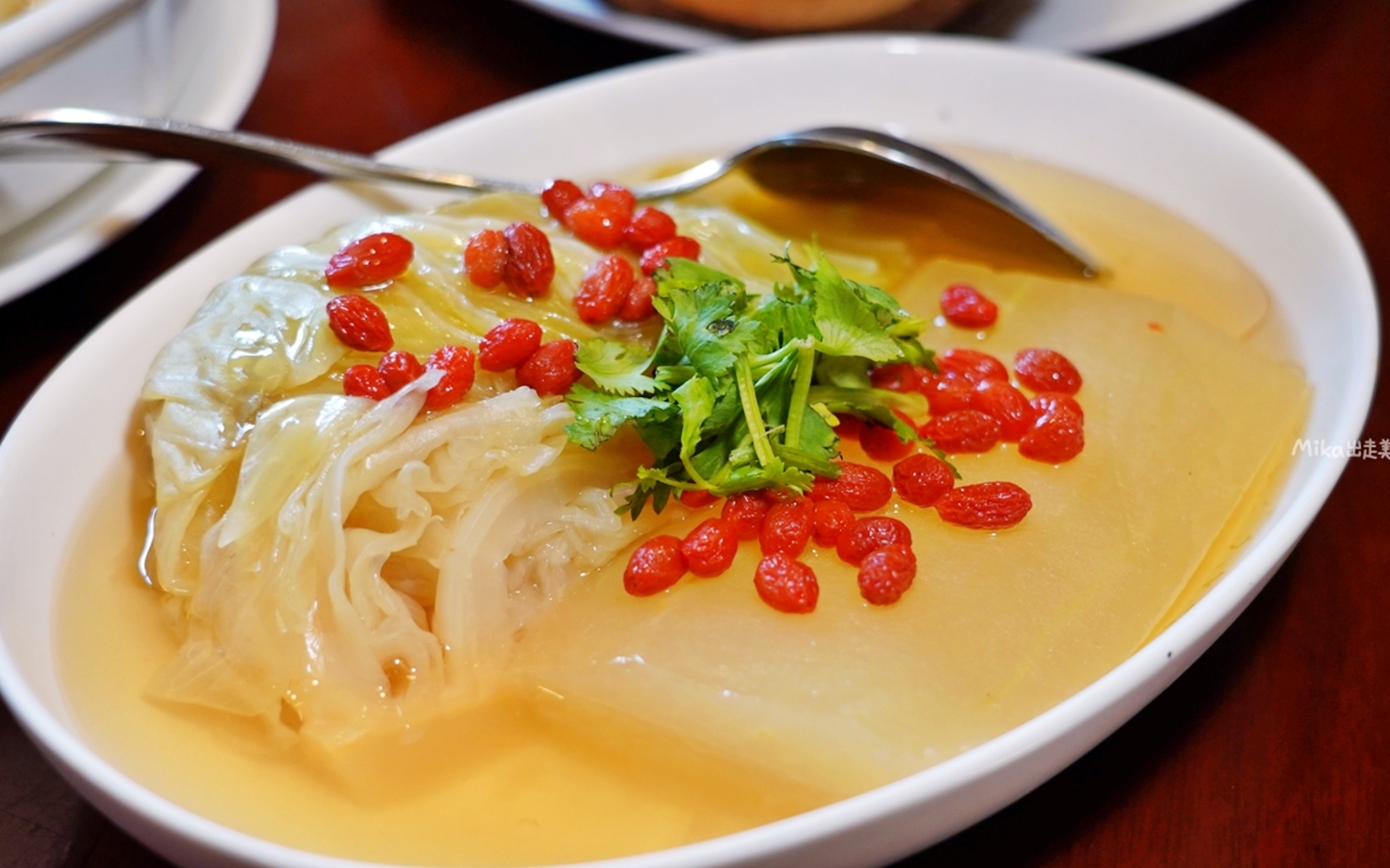 客家功夫菜之一,高麗菜、冬瓜以封煮的方式,加點枸杞與香菜,呈現食材本身的原味,清甜回甘,很清爽解膩的一道菜。