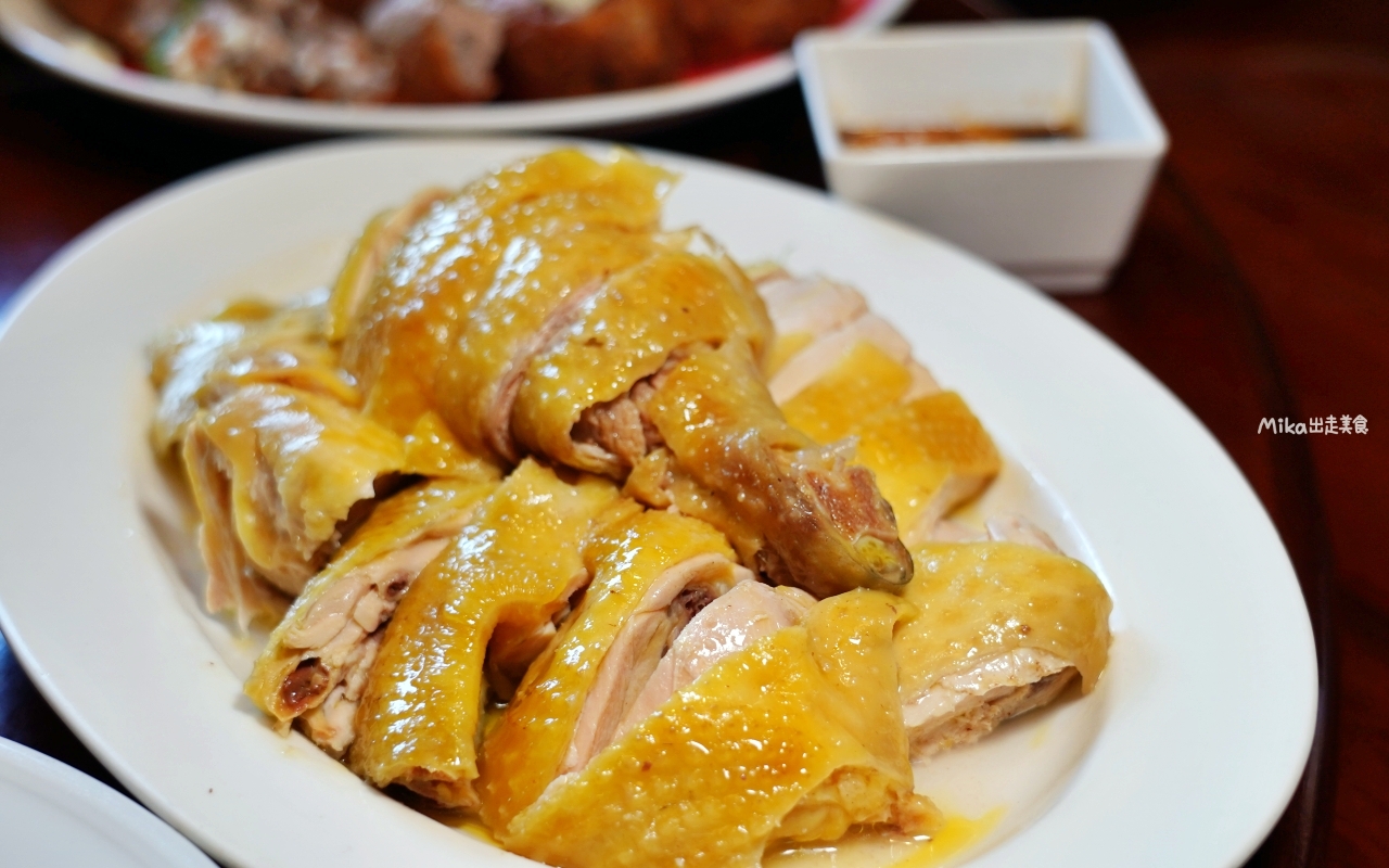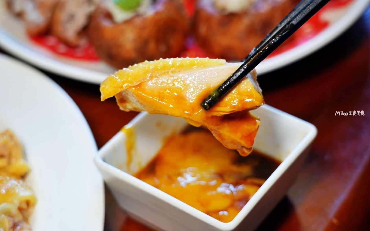 吃合菜怎麼可以少了白斬土雞!油亮油亮的是標配。選用在地放山雞,緊實肉質還很滑嫩美味,一定要沾客家桔醬才會更好吃。
