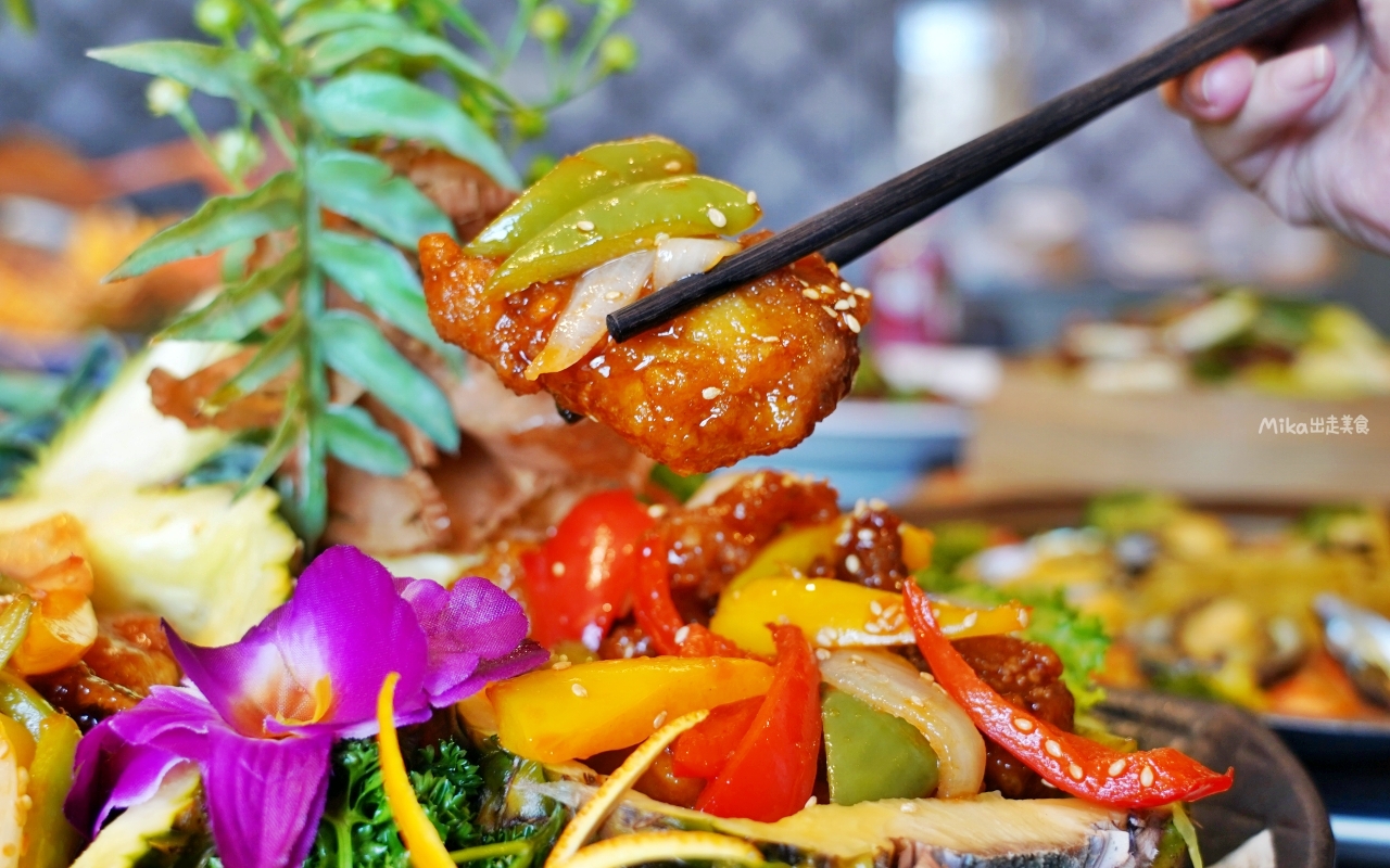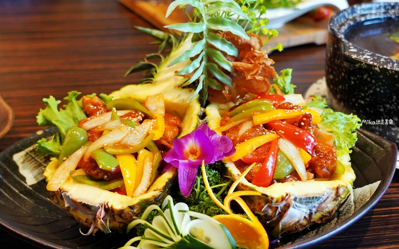 是熟悉的糖醋排骨,但採用鳳梨殼裝盤,整個華麗登場。