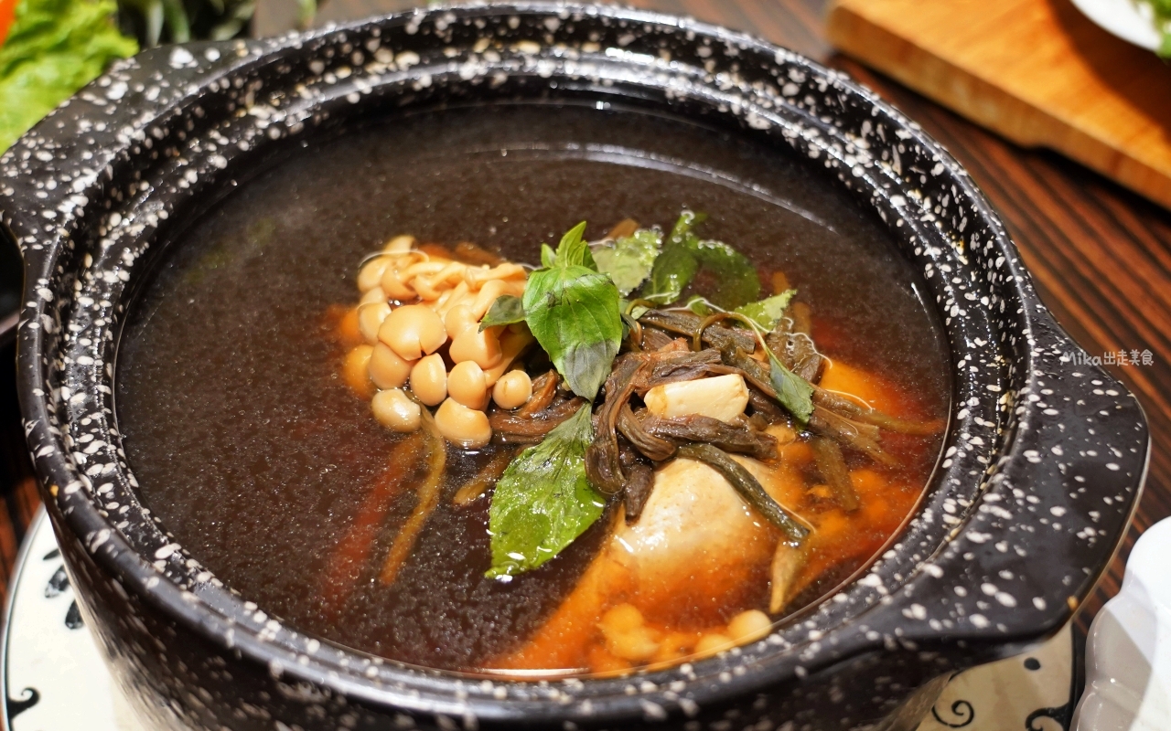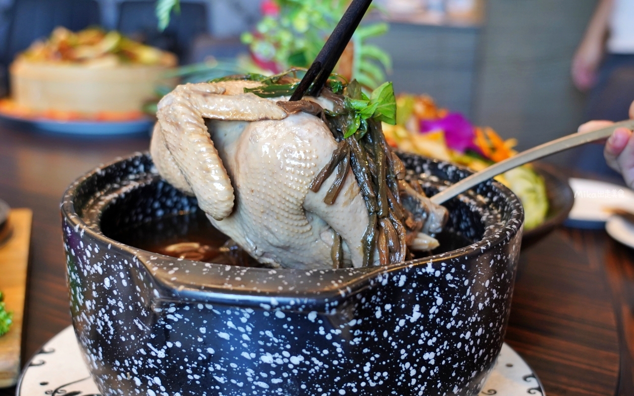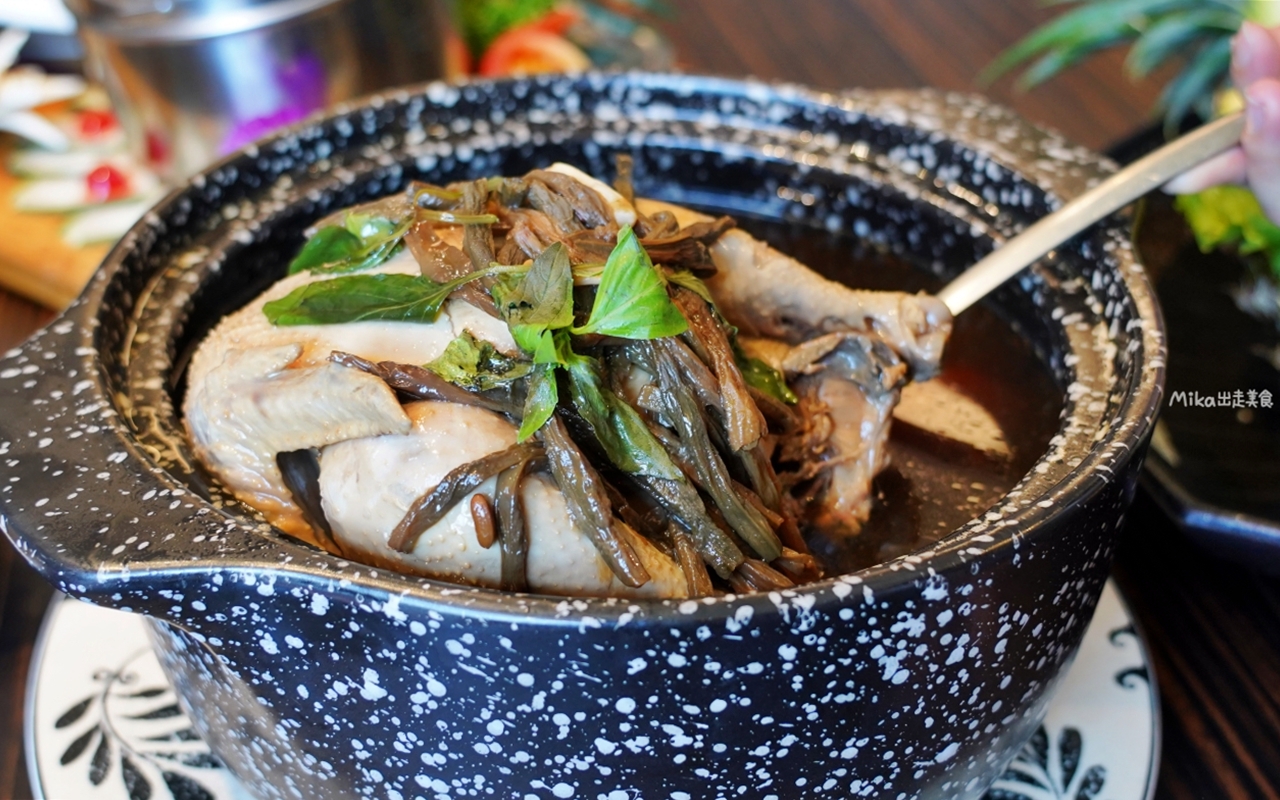 採用小白雞+干貝+蒜仁+枸杞+鮮菇跟豆仔乾一起燉煮入味,最後還加上九層塔提香!