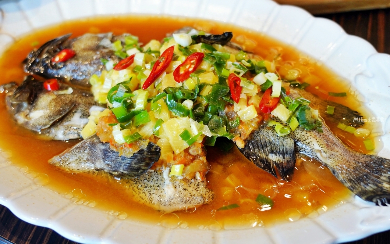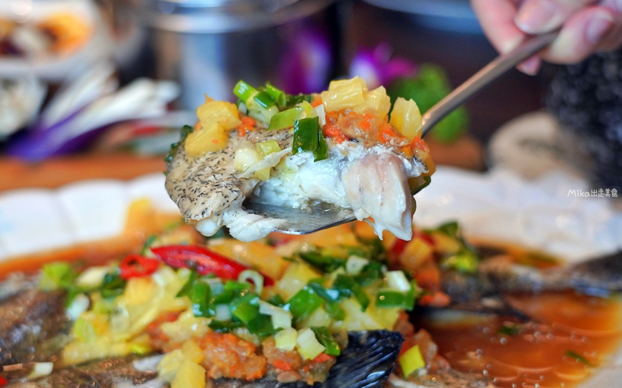 客家鹹鳳梨醬以外還搭配新鮮鳳梨丁與石斑魚蒸煮15分鐘,除了魚肉可以吃以外,還有搭配鳳梨果肉一起吃,有鳳梨果香+鹹香入味,好獨特。