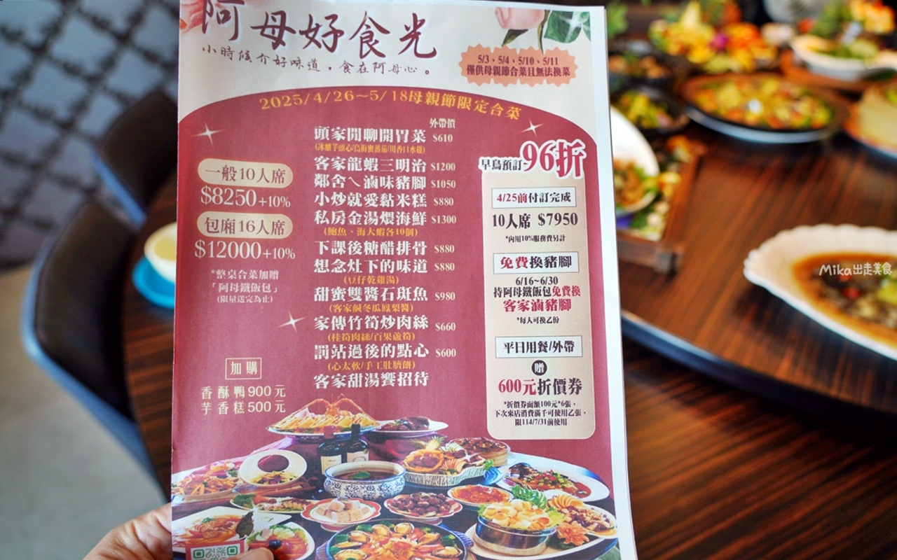 說到客家合菜餐廳,還得是我苗栗國的CP值最高!不枉費我們專程來頭份吃母親節限定合菜,簡直不要太划算了!不但10人一桌 8千有找,還可以免費換客家滷豬腳一份。不過這是早鳥優惠價喔,期間限定才有的小時候客家料理 創意合菜組合,既懷舊又創新,吃出記憶中的客家味。