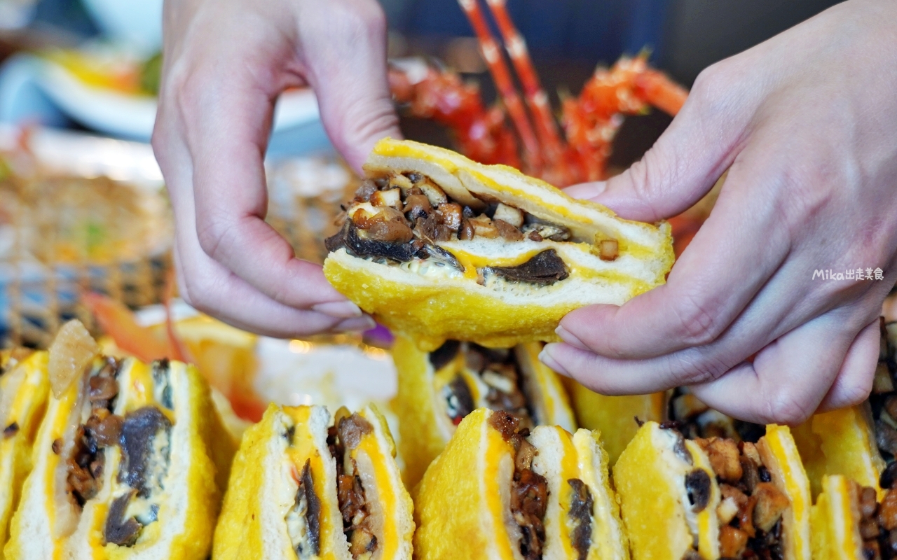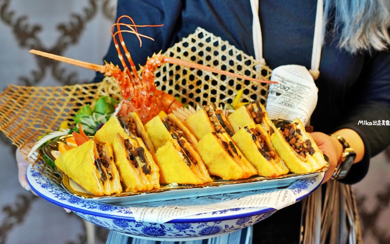 主要食材以豆干碎+菜脯+乾香菇碎跟龍蝦肉+金沙醬/美乃滋 的組合。