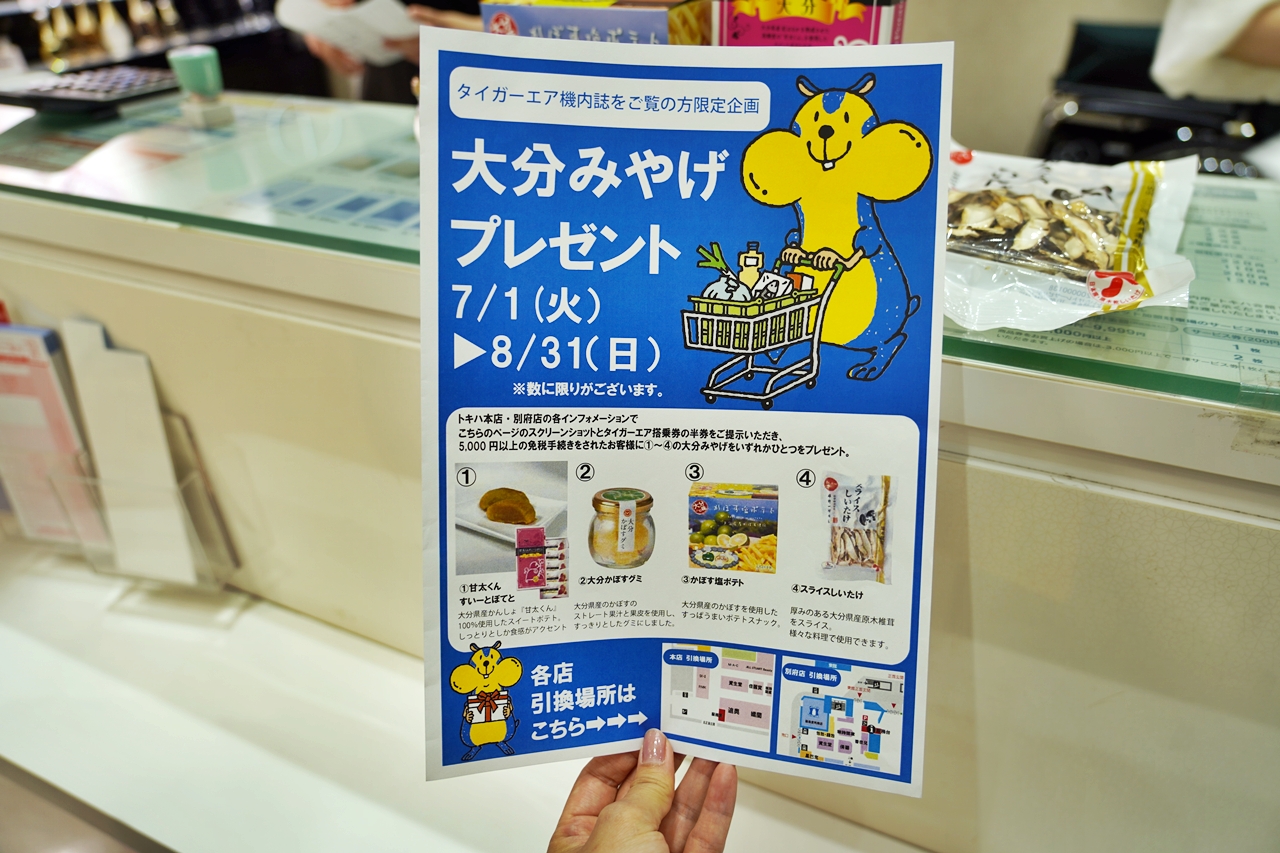 虎航與大分TOKIWA百貨合作,只要在TOKIWA本店或別府店 購買滿5000日幣以上,在ㄧ樓免稅櫃檯辦裡退稅手續+ 記得出示登機證或虎航官網截圖登機證明也可,就送大分縣小禮物:地瓜甜點、柚香檸檬軟糖、柚香檸檬薯條、香菇切片四選一!!