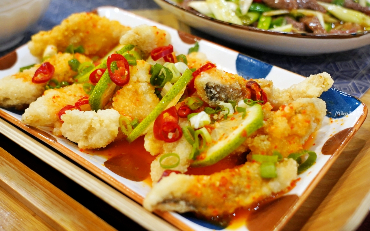 是酥炸魚塊,然後淋上泰式酸辣醬汁與檸檬片搭配。