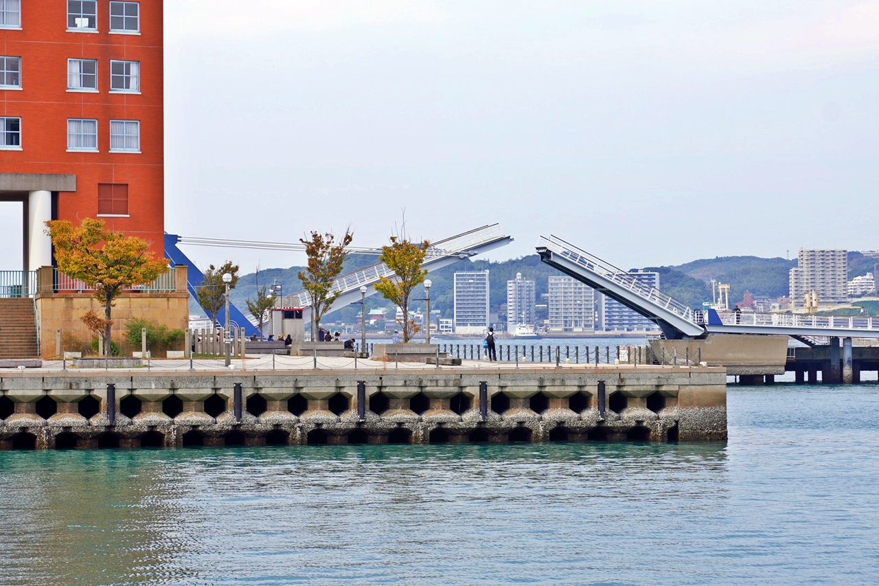 日本全國最大規模全長108m的步行者專用吊橋,1天有6次「藍翼門司」,可張開至和水面呈60度角,配合船隻航行一天開合6次,也可稱為『開門秀』,每次前後開合約20分鐘。