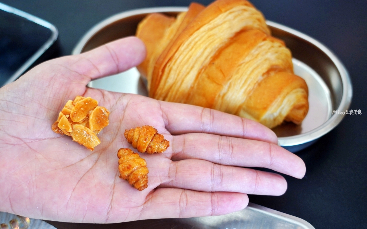 老闆看我們買不到很可惜,特別給兩顆讓我們吃吃看,太開心了。看看正常可頌跟迷你版本的比例真的差超多!好特別喔。