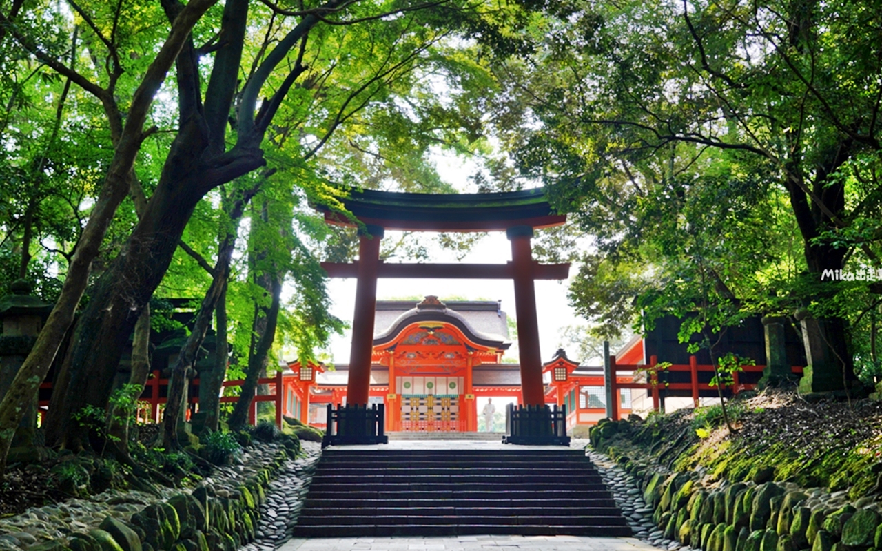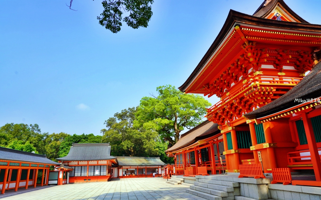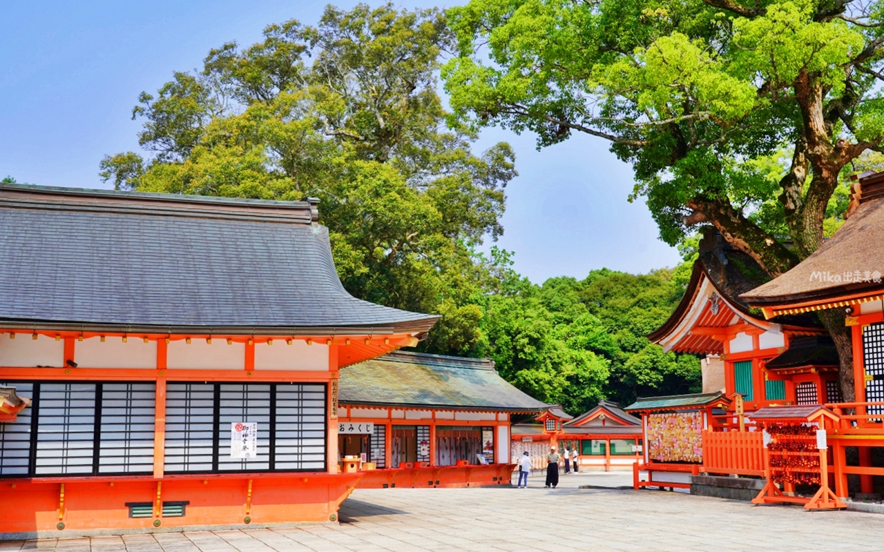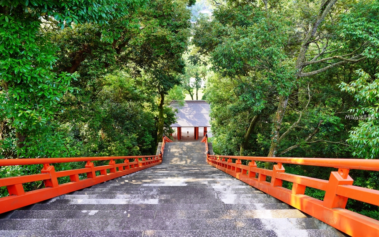 宇佐神宮域內,大片森林綠意,襯托鮮豔的朱紅色神殿、鳥居和小橋,景色優美。