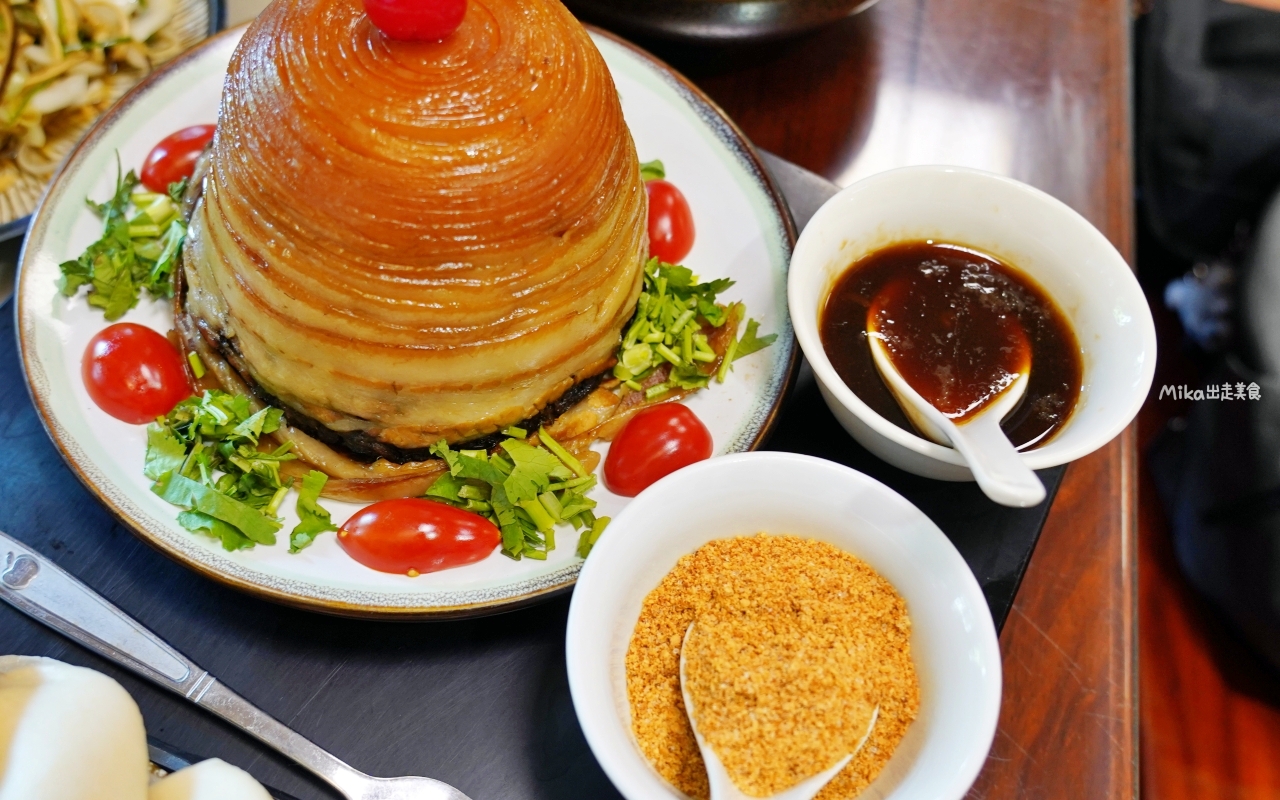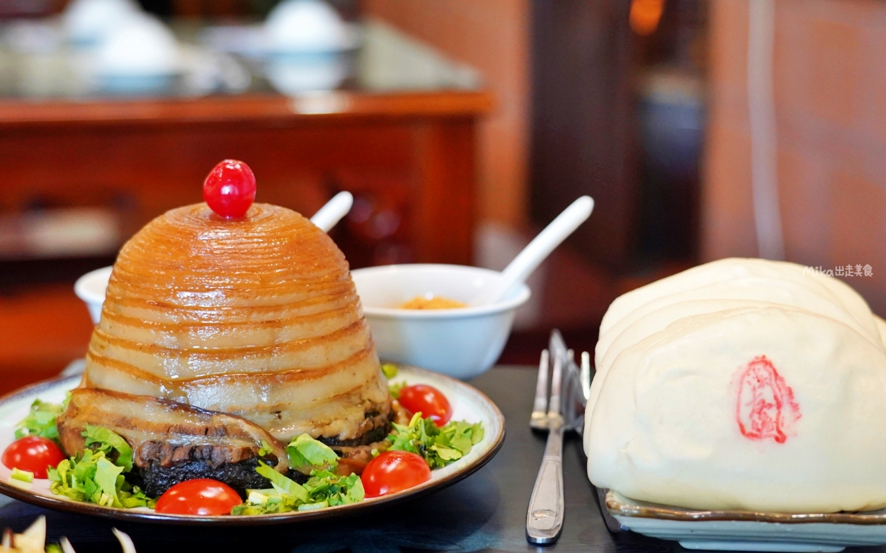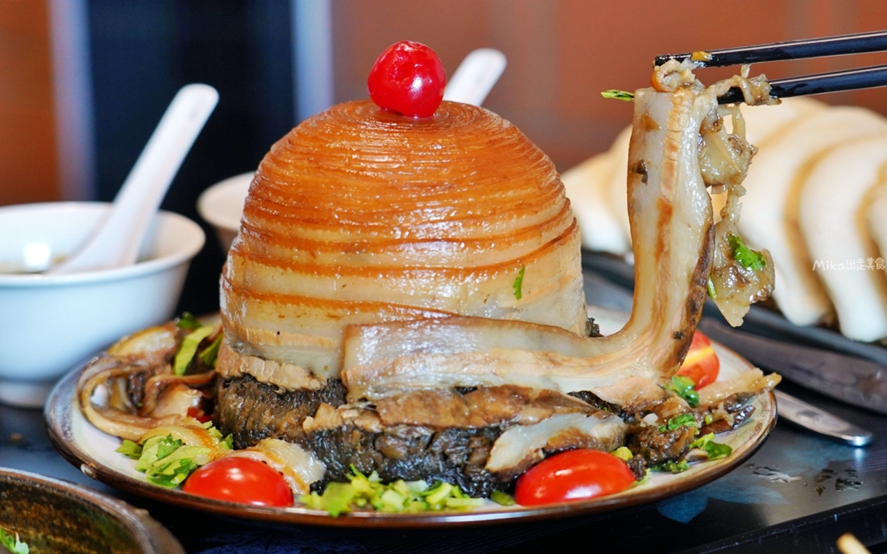 底層是特選的梅乾菜,將五花肉切成約300公分的長條薄片,然後將五花肉繞成大溪陀螺的形狀,上面再放上一顆櫻桃,真的很風情萬種。